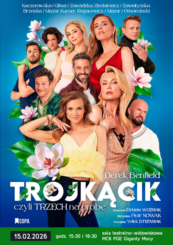 Miejskie Centrum Kultury w Bełchatowie zaprasza na spektakl pt. „Trójkącik, czyli trzech na próbę”, który odbędzie się 15 lutego 2026 r. o godzinie 15:30 oraz 18:30 w sali teatralno – widowiskowej MCK Giganty Mocy.