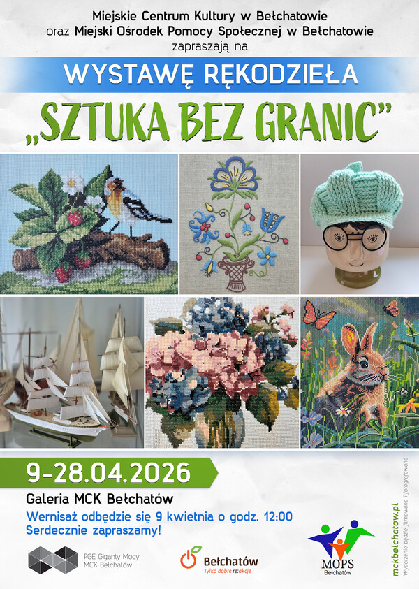 w Bełchatowie zapraszają na wernisaż wystawy prac artystycznych oraz rękodzieła pn. „SZTUKA BEZ GRANIC”, który odbędzie się 9 kwietnia o godzinie 12:00 w Galerii MCK.