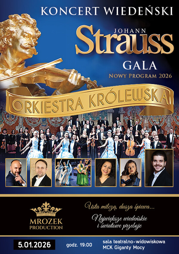 Miejskie Centrum Kultury w Bełchatowie zaprasza na Koncert Wiedeński - Johann Strauss Gala: Orkiestra Królewska - „W świecie operetki”, który odbędzie się 5 stycznia 2026 r. o godzinie 19:00 w sali teatralno – widowiskowej MCK Giganty Mocy.