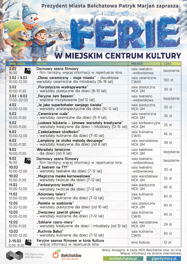 Prezydent Miasta Bełchatowa Patryk Marjan zaprasza na Ferie Zimowe w Miejskim Centrum Kultury.